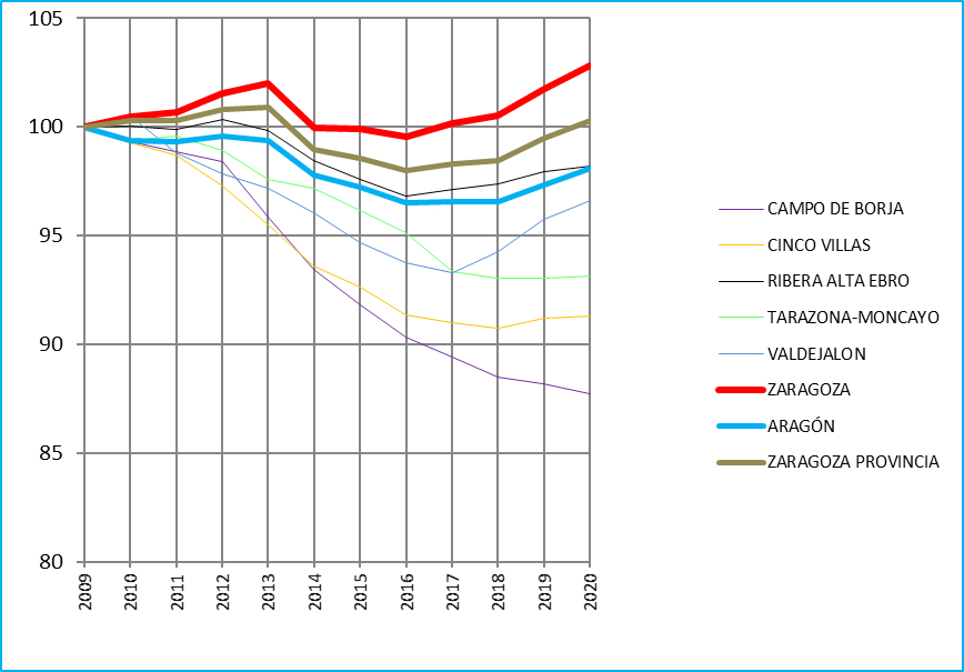 Poniendo como base 100 la población de cada una de ellas en el año 2009, al igual que Zaragoza ciudad, Zaragoza provincia y Aragón, vemos como a día de hoy ni siquiera el centrífugo “efecto COVID” ha hecho revertir la situación a niveles de este año. Por el contrario, Zaragoza ciudad ha aumentado su población, compensando la estabilidad demográfica del resto de la provincia. Es de destacar que la población total de Aragón no llega a los niveles de 2009. También es a destacar el dramático descenso de comarcas como CAMPO DE BORJA y CINCO VILLAS, que han perdido un 12,27% y un 8,68% de su población respectivamente sin minimizar el descenso del resto de comarcas.