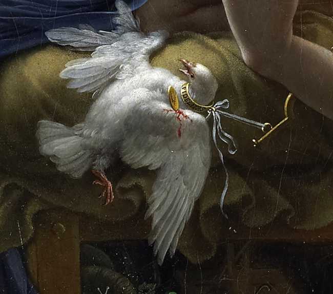 Una con un collar que le ahoga, en el cual se puede leer en latín “Fidelitas” muere herida en un ala por una moneda. Más claro… La otra, con el collar de Constancia, directamente escapa.