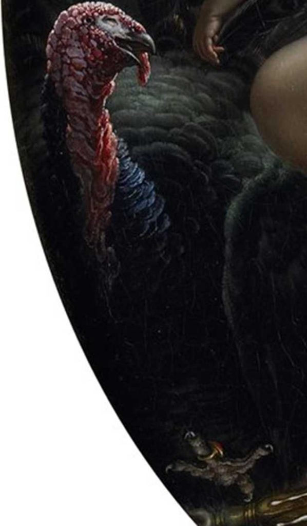 El pavo, el animal más presuntuoso y feo del corral representa al marido de la protagonista, el banquero Simons. Hinchado de vanidad, y por si hay alguna duda de quién es, le coloca un anillo de casado en uno de sus dedos, que muestra ufano.